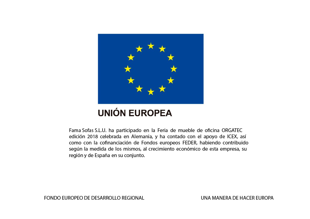Fama Sofas S.L.U. hat an der Büromöbelmesse ORGATEC 2018 in Deutschland teilgenommen, und zählte mit der Unterstützung vom staatlichen spanischen Außenhandelsinstitut, sowie mit der Mitfinanzierung des EFRE, der sein Teil zu dem Wirtschafswachstum dieses Unternehmen, der Region und von Spanien insgesamt beigetragen hat.