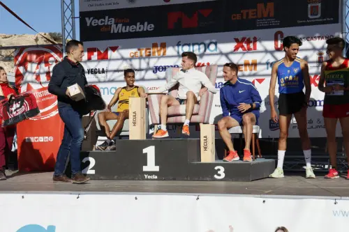 El pasado domingo 15 de diciembre se celebró la 37 Edición del Cross Nacional Fiestas de la Virgen de Yecla 2019 con gran ambiente en las instalaciones del complejo deportivo Juan Palao. Durante la soleada mañana, se disputaron las pruebas de las diferentes categorías para rematar la jornada con las pruebas absoluta femenina y masculina, siendo Carlos Mayo y María José Pérez los ganadores absolutos. Este año y como novedad, el podio contó con carácter solidario y se sortearon los sillones al finalizar las pruebas, entre todas las personas que adquirieron una papeleta a beneficio de Cáritas. Un podio con sillones que se ha convertido en un clásico del Cross de Yecla, donde los atletas pueden reponerse del esfuerzo sentados cómodamente en los sillones mientras le entregan los diferentes trofeos.