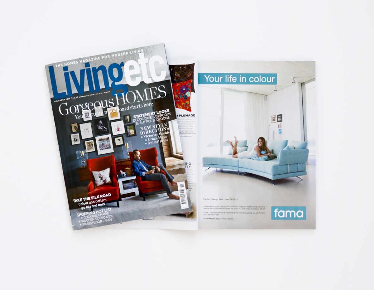 En el número de noviembre de la revista británica especializada en decoración Living ETC, podéis encontrar una página con nuestro sofá Pacific. De esta forma, Fama refuerza su campaña de publicidad en medios especializados de UK con el fin de llegar a más público interesado en nuestros sofás. Además también aparece una mención del sofá Astoria en el apartado de novedades donde destacan el diseño de esta pieza tan especial.
