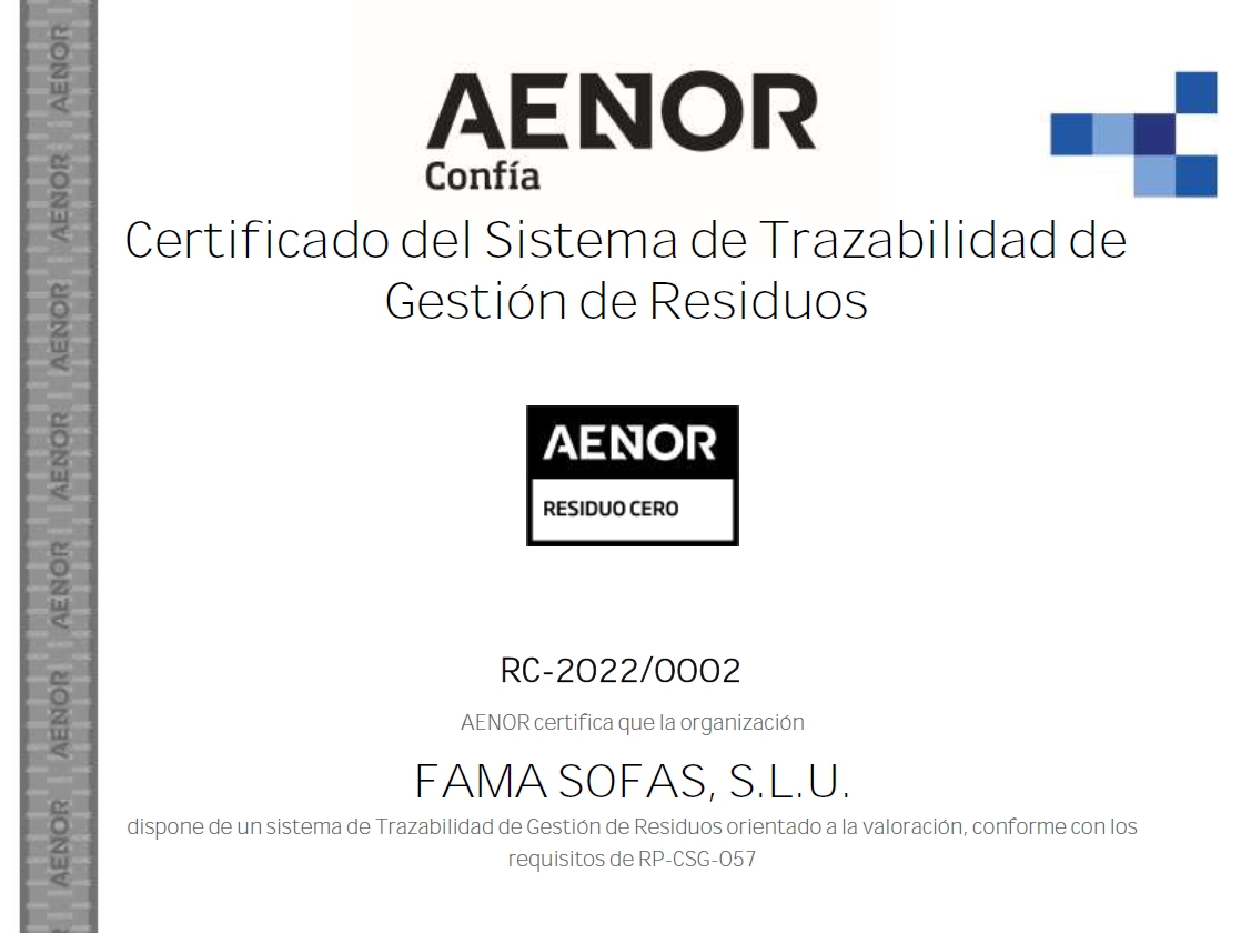 Fama acaba de recibir por parte de AENOR, la certificación de “Residuo Cero”. Esta certificación garantiza que más del 90% de los residuos industriales de una empresa están valorizados. Esto significa que estos residuos no van a parar a un vertedero, teniendo una segunda vida útil, ya sea en forma de reutilización, de creación de nuevas materias primas o triturado para crear combustible sólido.