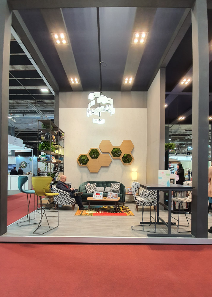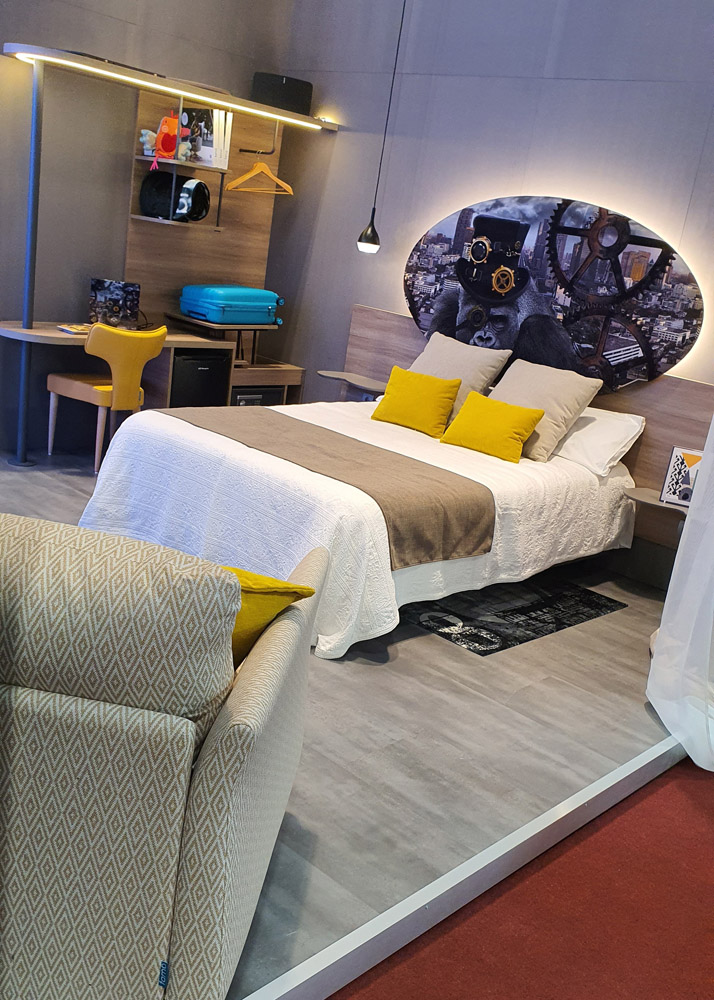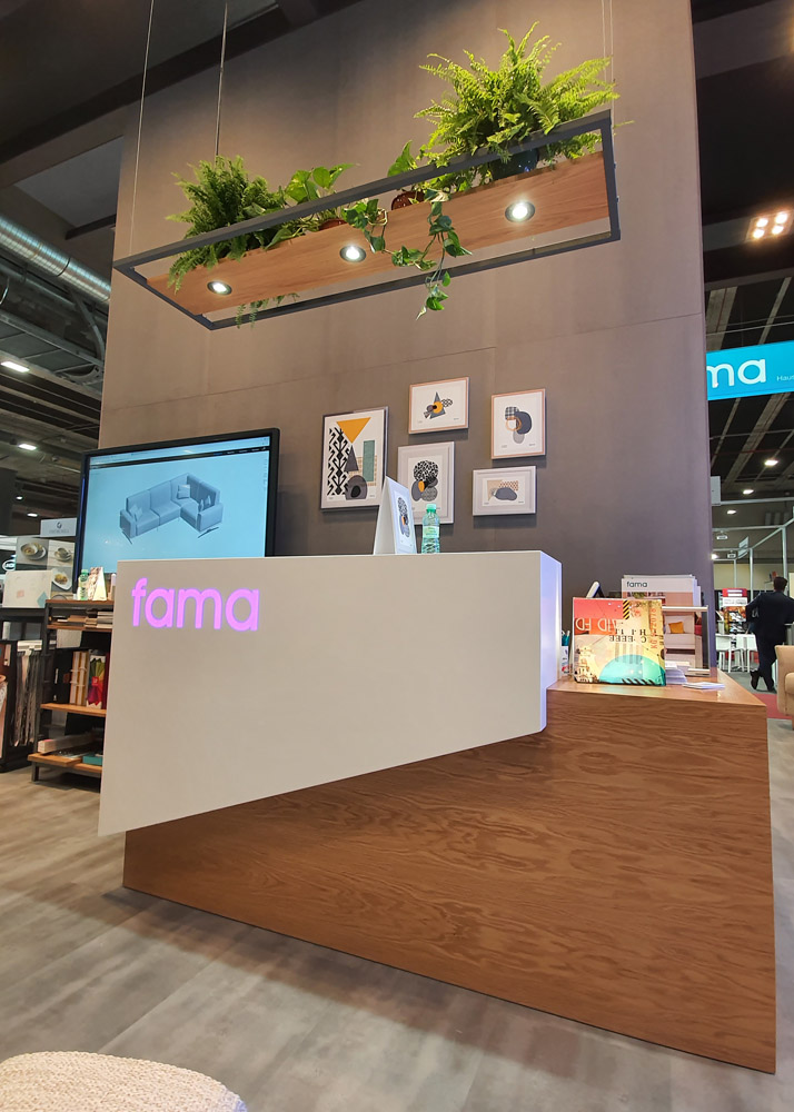 El stand de Fama Solutions mostraba algunas posibilidades que pueden ser fabricadas por el equipo de Fama Solutions entre las que se incluía un diseño de habitación de hotel, un recibidor de hotel, una sala de espera junto con diferentes elementos auxiliares decorativos y de asiento. Están siendo unas semanas muy satisfactorias para todo el equipo de diseño y montaje, con la inauguración del Primer hotel amueblado íntegramente por Fama, y la elaboración de un gran número de proyectos.