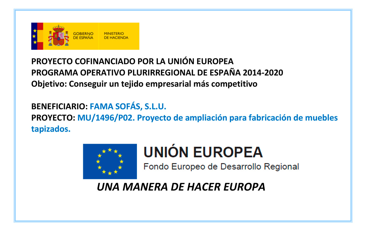 FAMA SOFÁS, S.L.U. ha sido beneficiaria del Programa Operativo Plurirregional de España 2014-2020 para el desarrollo del Proyecto de ampliación para fabricación de muebles tapizados, MU/1496/P02. El proyecto ha sido cofinanciado por la unión europea bajo el objetivo de conseguir un tejido empresarial más competitivo.