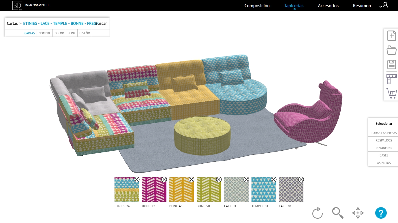 Fama presenta la nueva aplicación web Fama 3D SIM. Una aplicación que permite configurar cualquier elemento del catálogo de Fama, así como añadirle nuevos elementos hasta crear la composición de un salón y personalizar todos los accesorios. Una vez realizado el diseño del sofá, podréis elegir la combinación de telas que mejor se adapte a vuestro hogar, así como consultar las medidas. Una aplicación que facilitará el diseño y la configuración de nuestros sofás tanto a clientes finales como a profesionales de la decoración.