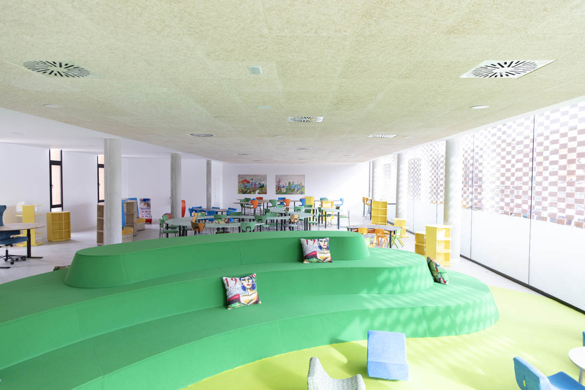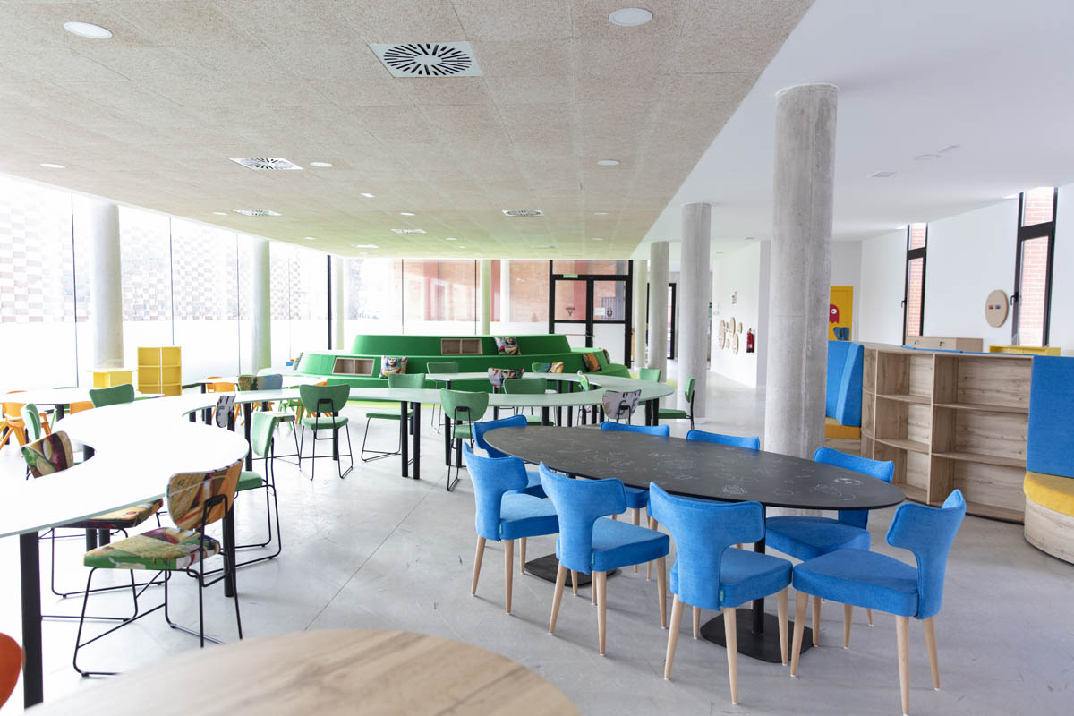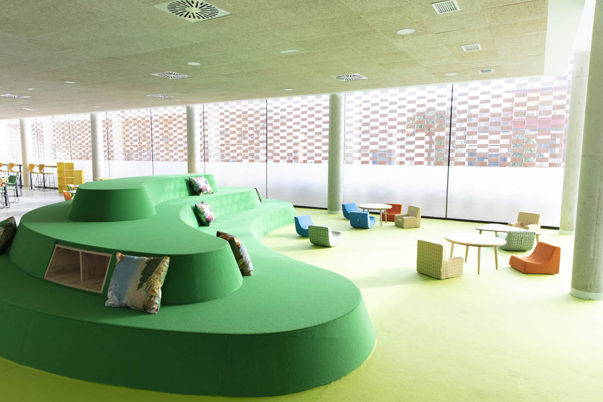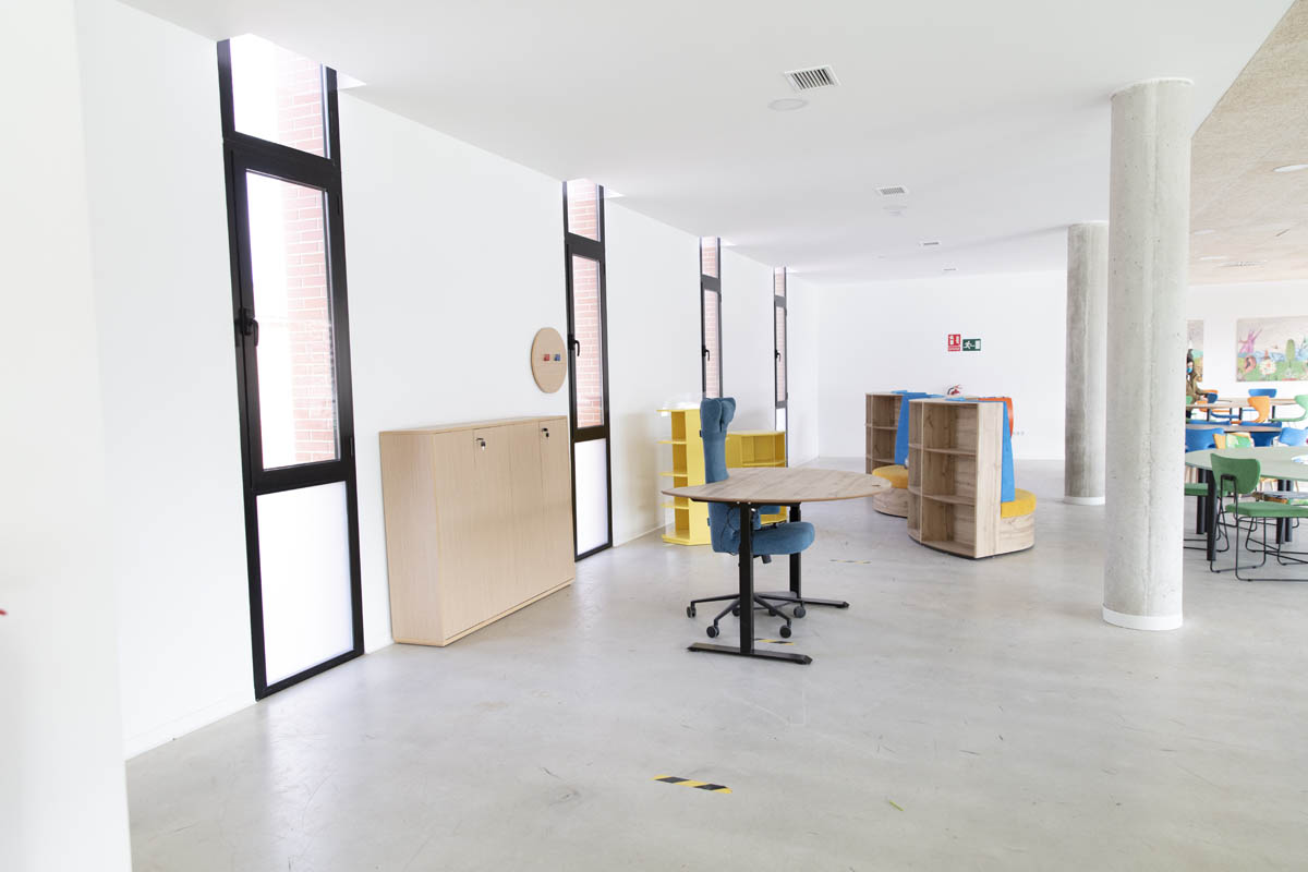 ‘La Alameda’ se ha dividido en distintos espacios destinados a varios fines. Los espacios para trabajo en equipo, diferenciados por edades, han sido equipados para adaptarse a las necesidades de los usuarios y convertirse en un lugar en el que trabajar junto a compañeros o amigos. Por otra parte, también se ha querido equipar una parte de la sala que sirva para la concentración y la reflexión individual. Para ello se ha dotado a ese espacio con un sillón estantería modular, con forma curva y envolvente que invita a la concentración; además de con la tumbona basculante ‘La siesta’.