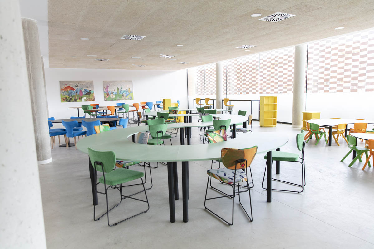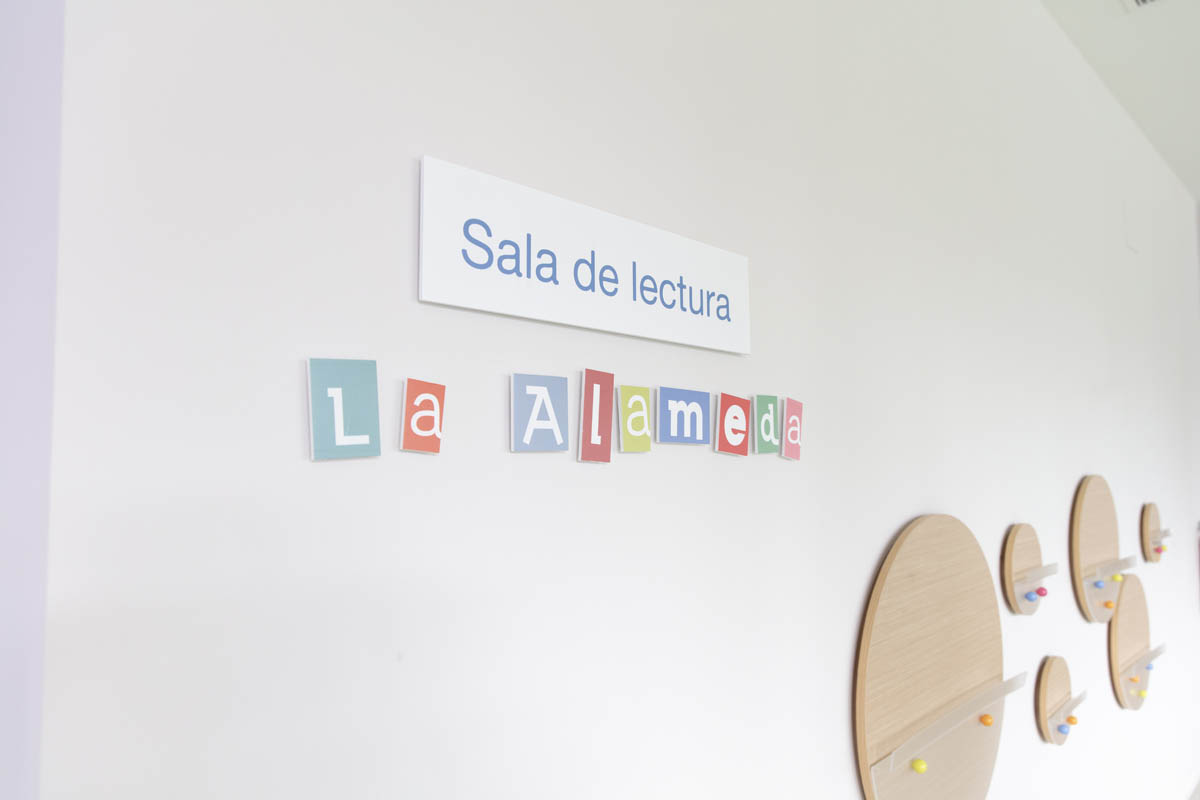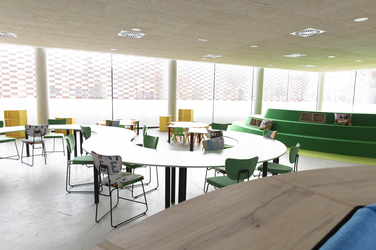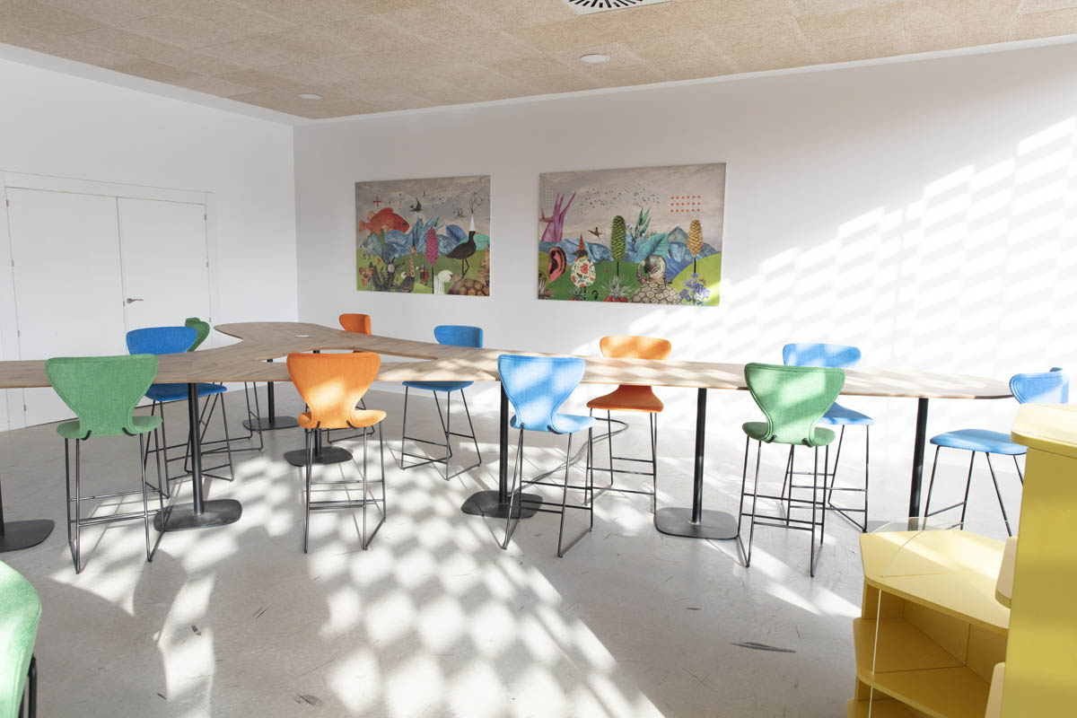 ‘La Alameda’ se ha dividido en distintos espacios destinados a varios fines. Los espacios para trabajo en equipo, diferenciados por edades, han sido equipados para adaptarse a las necesidades de los usuarios y convertirse en un lugar en el que trabajar junto a compañeros o amigos. Por otra parte, también se ha querido equipar una parte de la sala que sirva para la concentración y la reflexión individual. Para ello se ha dotado a ese espacio con un sillón estantería modular, con forma curva y envolvente que invita a la concentración; además de con la tumbona basculante ‘La siesta’.