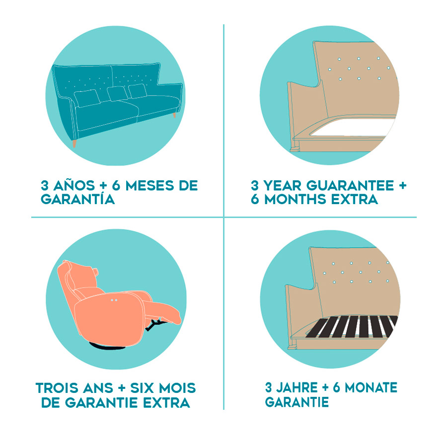 - Le reste du canapé est garanti 3 ans, quipeut être prolongé de 6 mois, si on active la garantie à travers de notre page web.