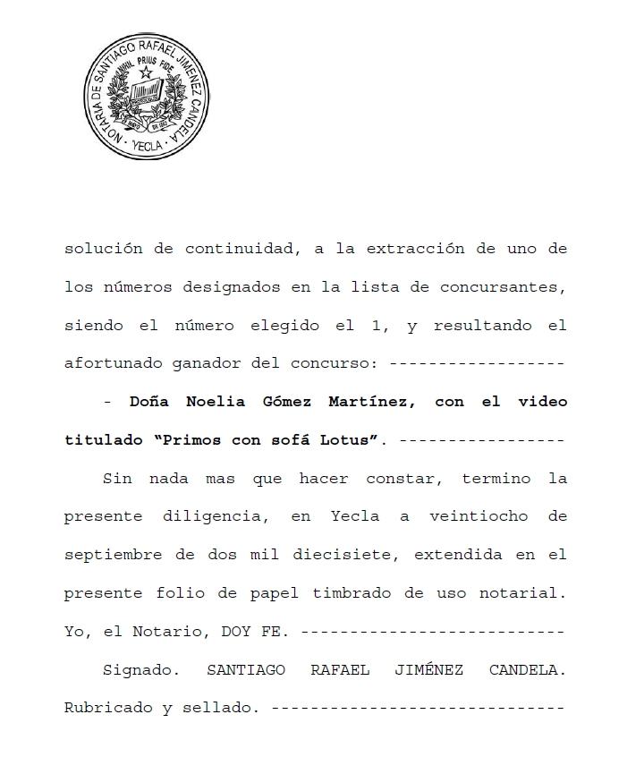 Parmi les 11 participants, nous avons réalisé un tirage au sort devant notaire et le gagnant a été la vidéo intitulée « Primos con sofá Lotus » envoyé par Noelia Gómez Martínez.  Noelia qui a acheté son canapé chez Famaliving Granollers pourra profiter d’un voyage à Disneyland Paris en compagnie de sa famille.  Félicitations !