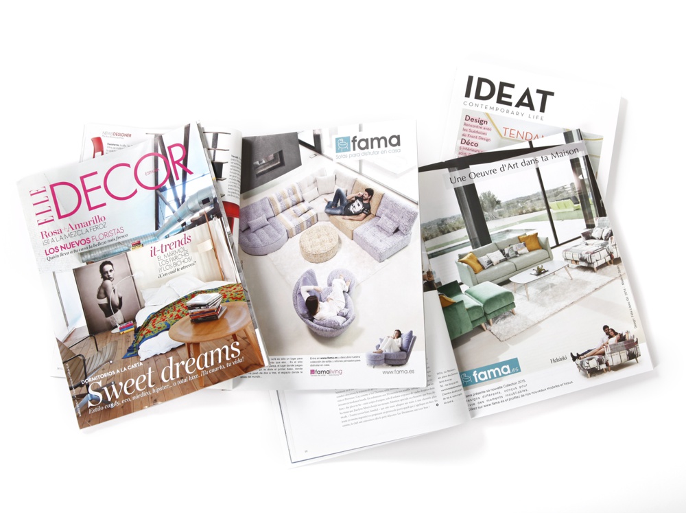 Fama Sofas, a lancé la nouvelle campagne publicitaire 2015 à niveau international dans les magazines. En Espagne, le magazine qui a été choisi est « Elle Décoration » dans lequel nous pourrons apprécier durant toute cette année dans chaque numéro, les tendances de tissus de la nouvelle collection de canapés 2015. En Inde, le magazine « Elle Décoration « a été également élu pour faire apparaître nos modèles dans le pays asiatique. En France, nous continuons une année de plus avec « IDEAT », un magazine qui est la référence dans le pays voisin, montrant les nouvelles tendances de design et confort pour cette année 2015 et de plus cette année, elles seront accompagnées de nos nouveaux designs de meubles pour jardin.