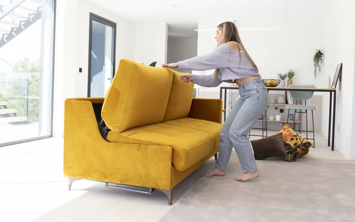 Lo más destacado de este sofá cama es su gran comodidad tanto como sofá como cama. Disfruta de agradables momentos de descanso y relajación en su posición de sofá y, cuando sea necesario, conviértelo en una cómoda cama con su mecanismo de apertura italiano. Su ligereza permite abrirlo sin esfuerzo y su diseño de pata alta facilita el acceso al robot aspirador debajo del sofá.