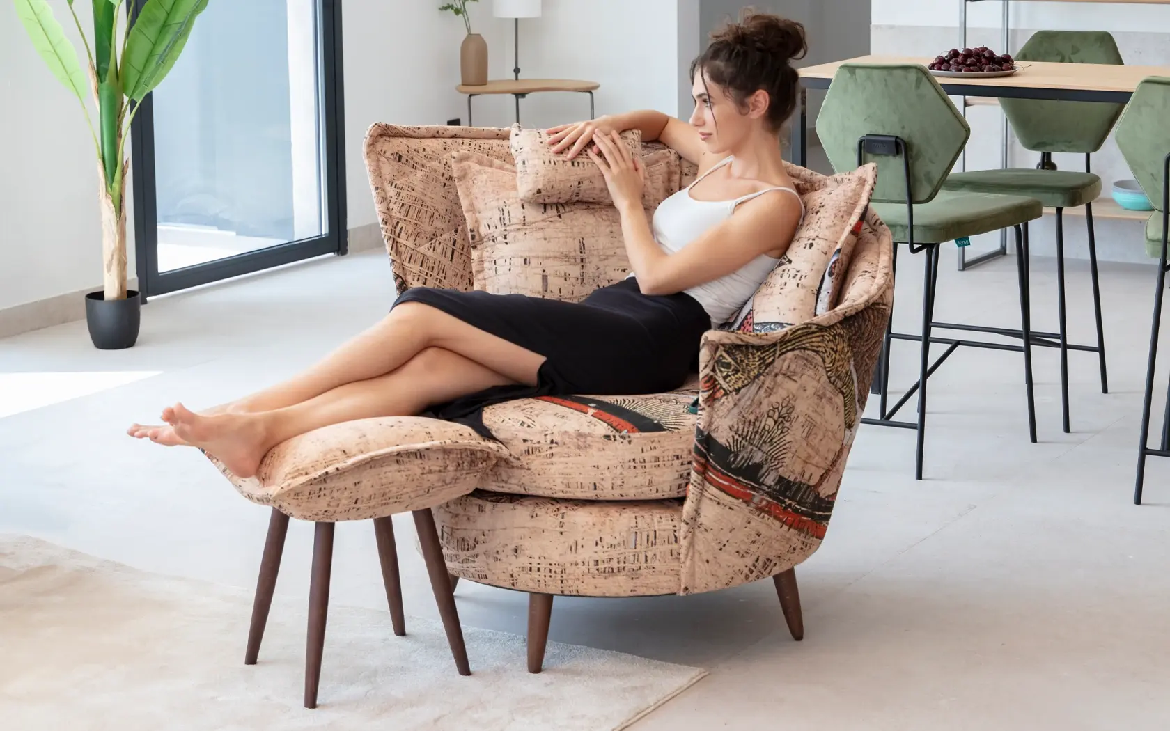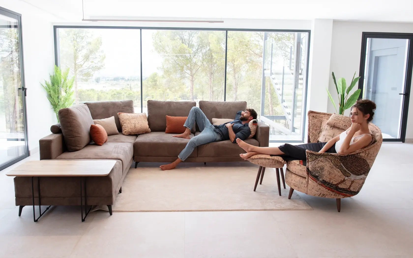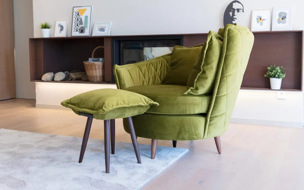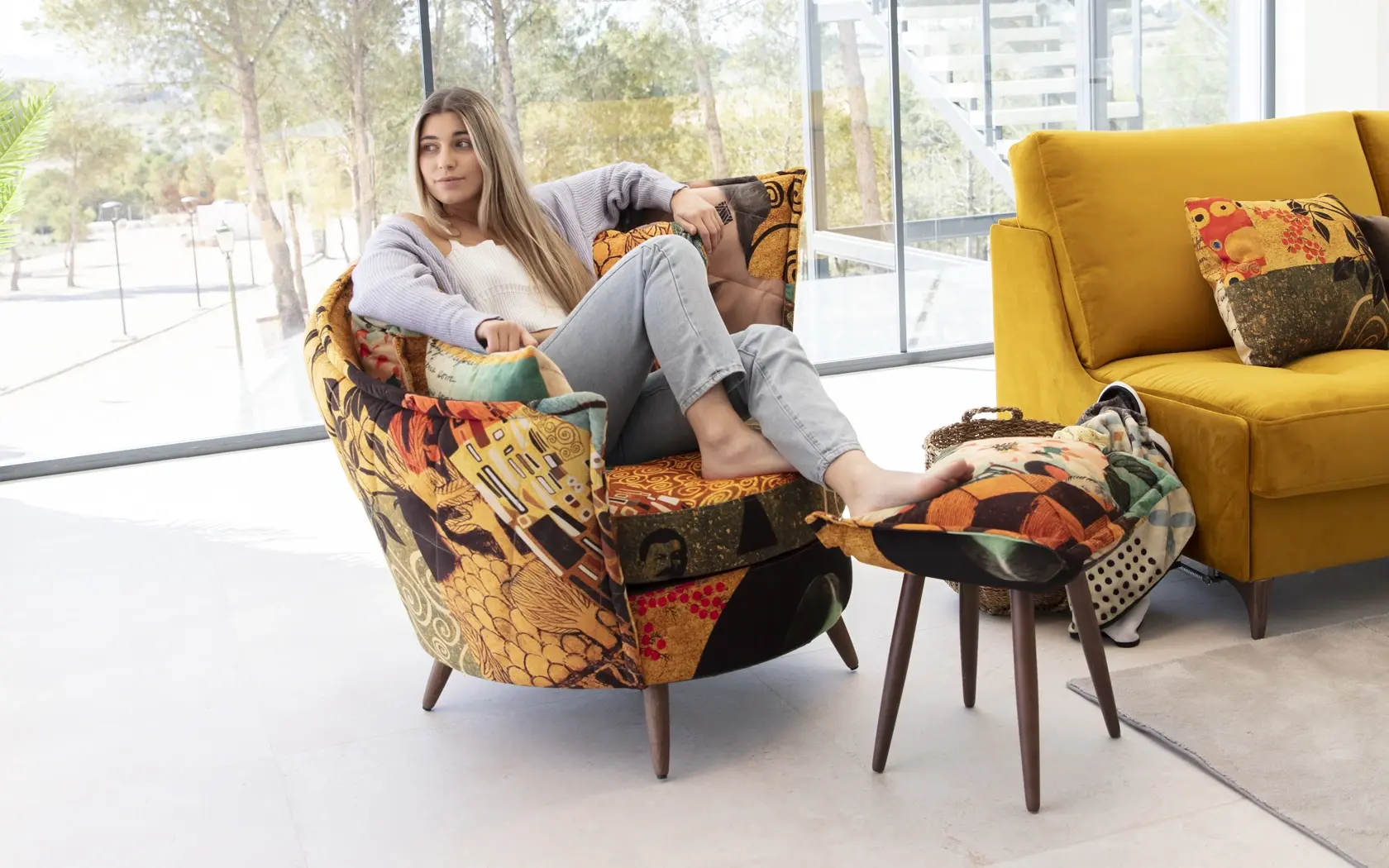 Este diseño ligero y atractivo, con su moderno acolchado en el respaldo y su forma decreciente, se completa con un ligero puff reposapiés, que en un abrir y cerrar de ojos se transforma en mesa supletoria.
