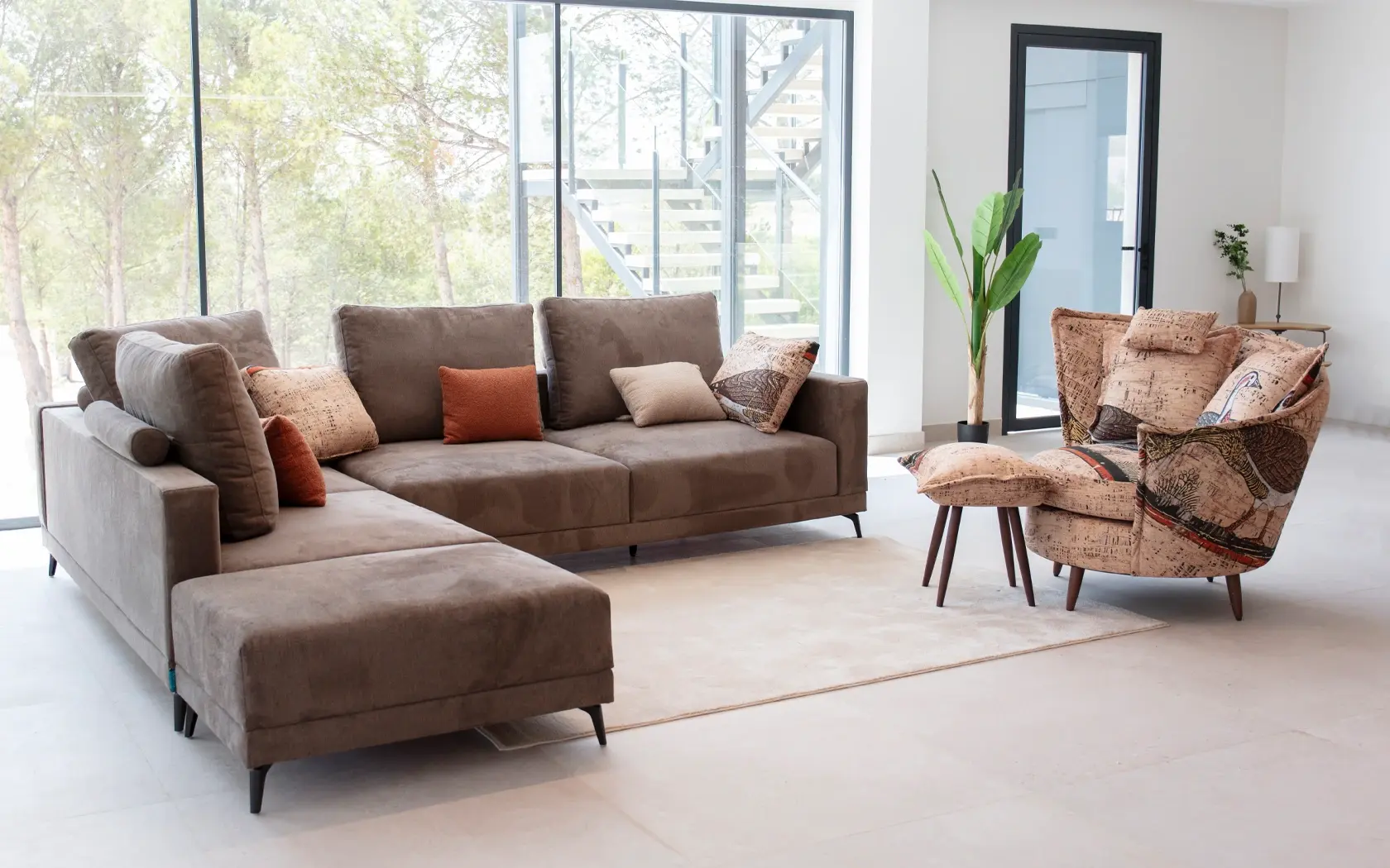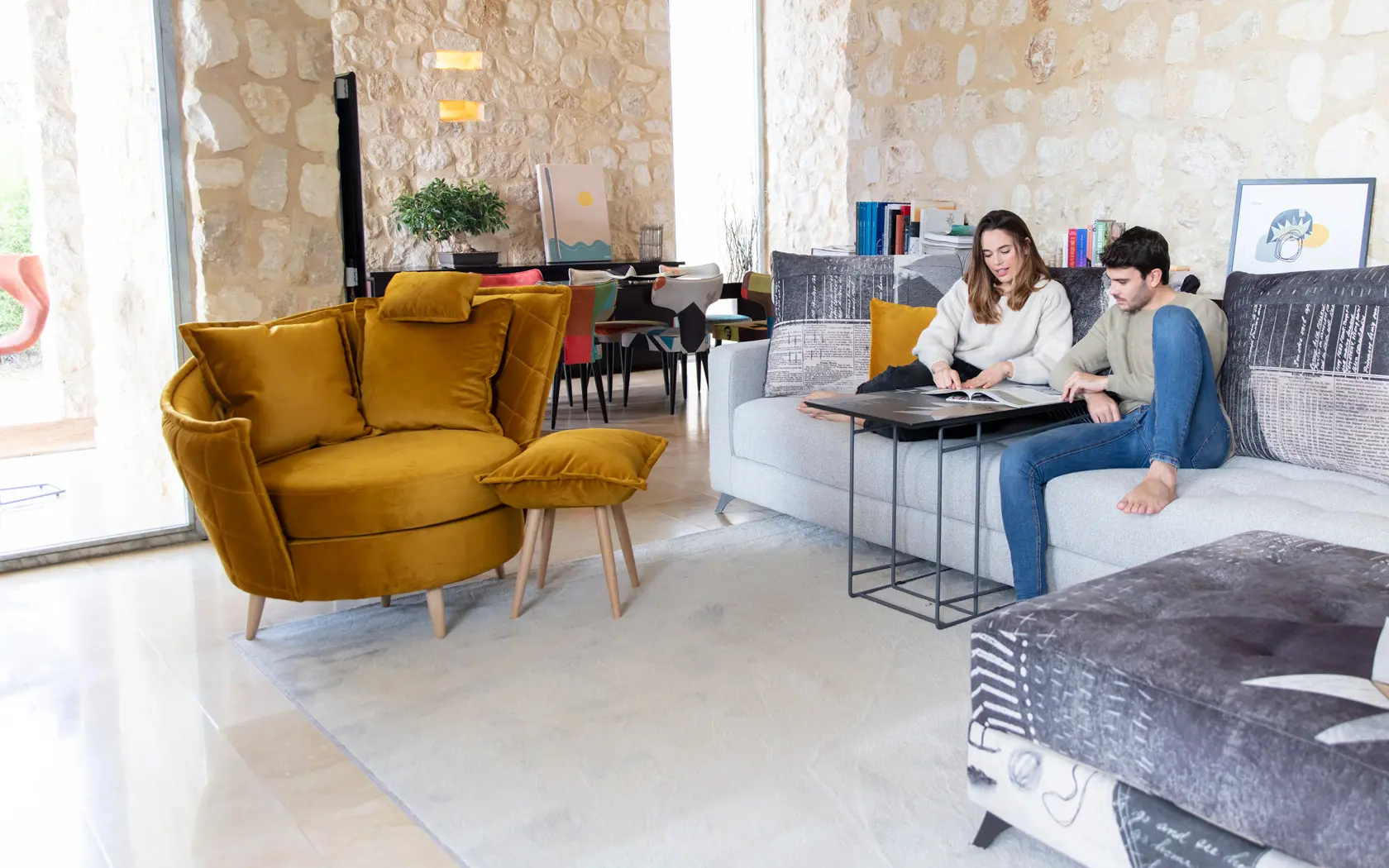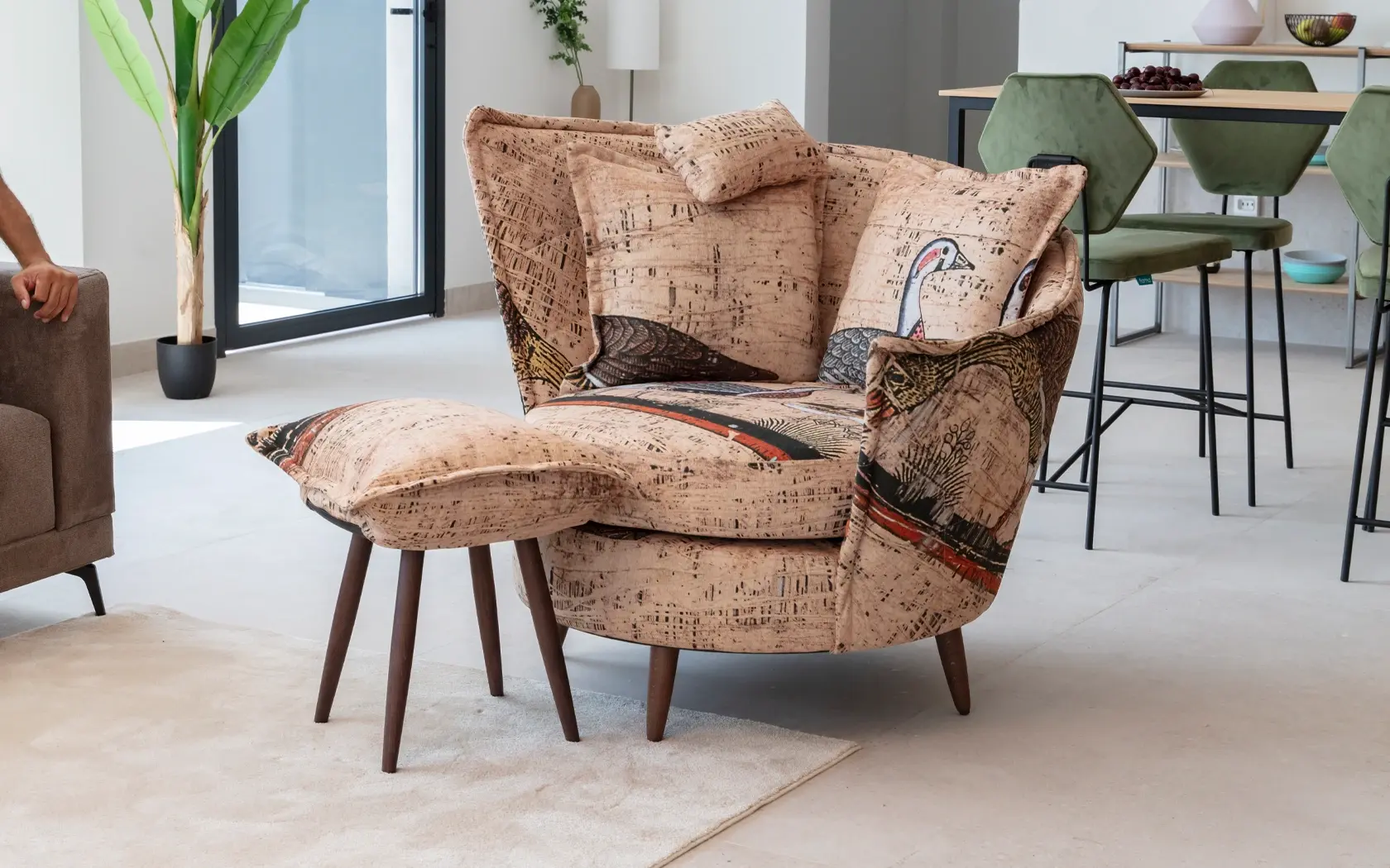 Este diseño ligero y atractivo, con su moderno acolchado en el respaldo y su forma decreciente, se completa con un ligero puff reposapiés, que en un abrir y cerrar de ojos se transforma en mesa supletoria.